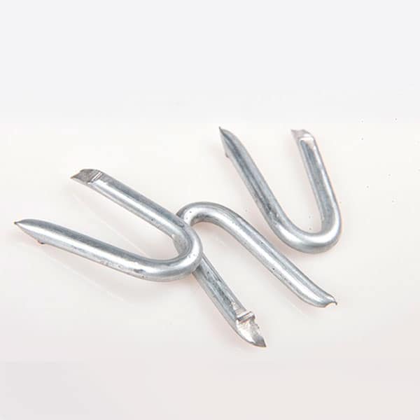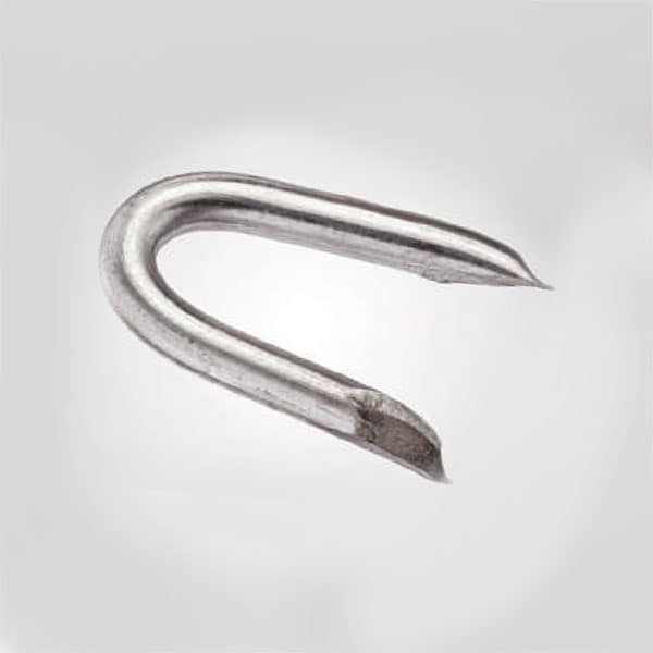 Elemento de fijación galvanizado en forma de U con terminaciones en punta en sus dos extremos.